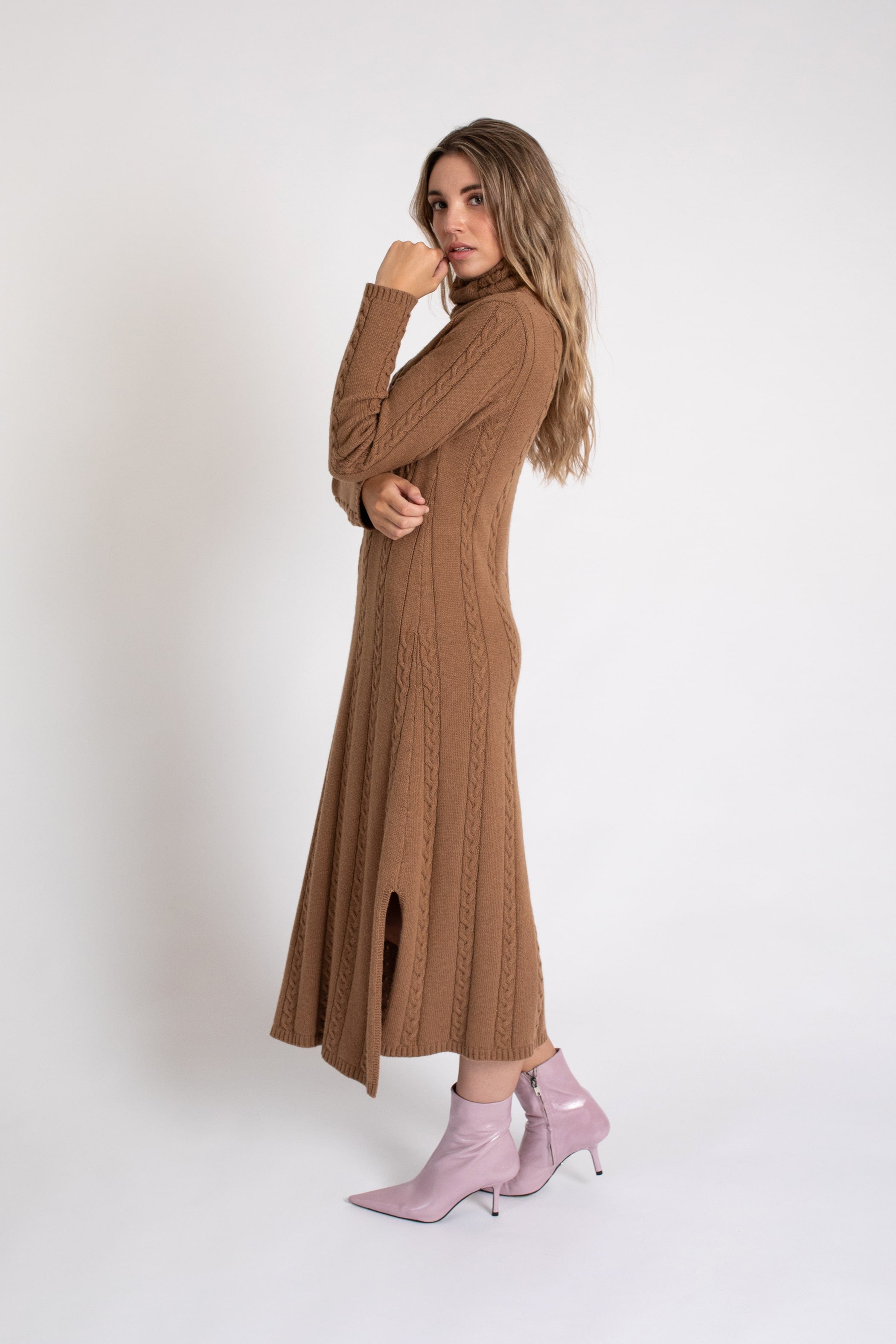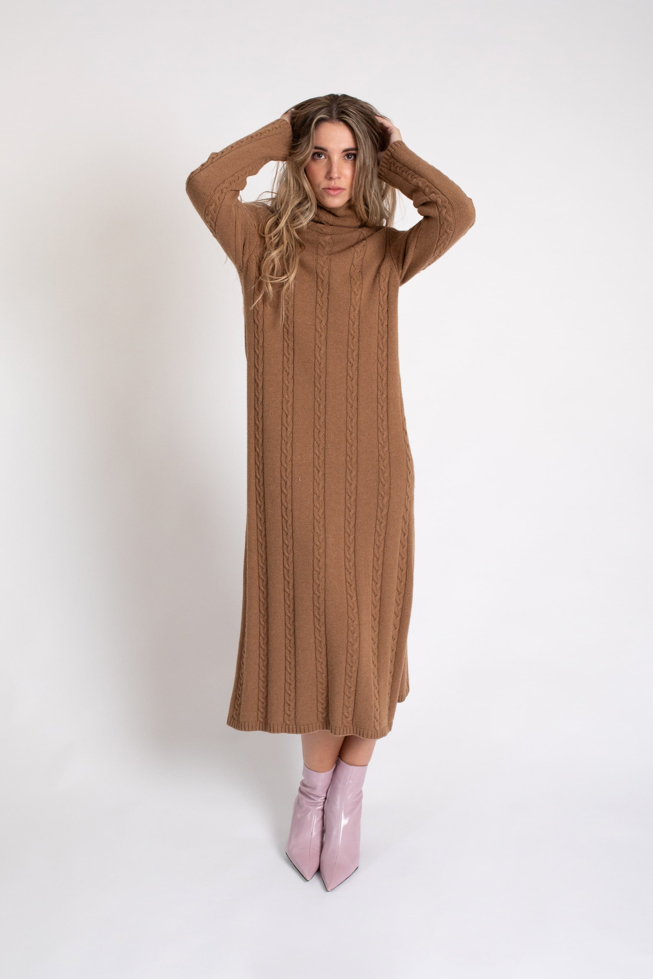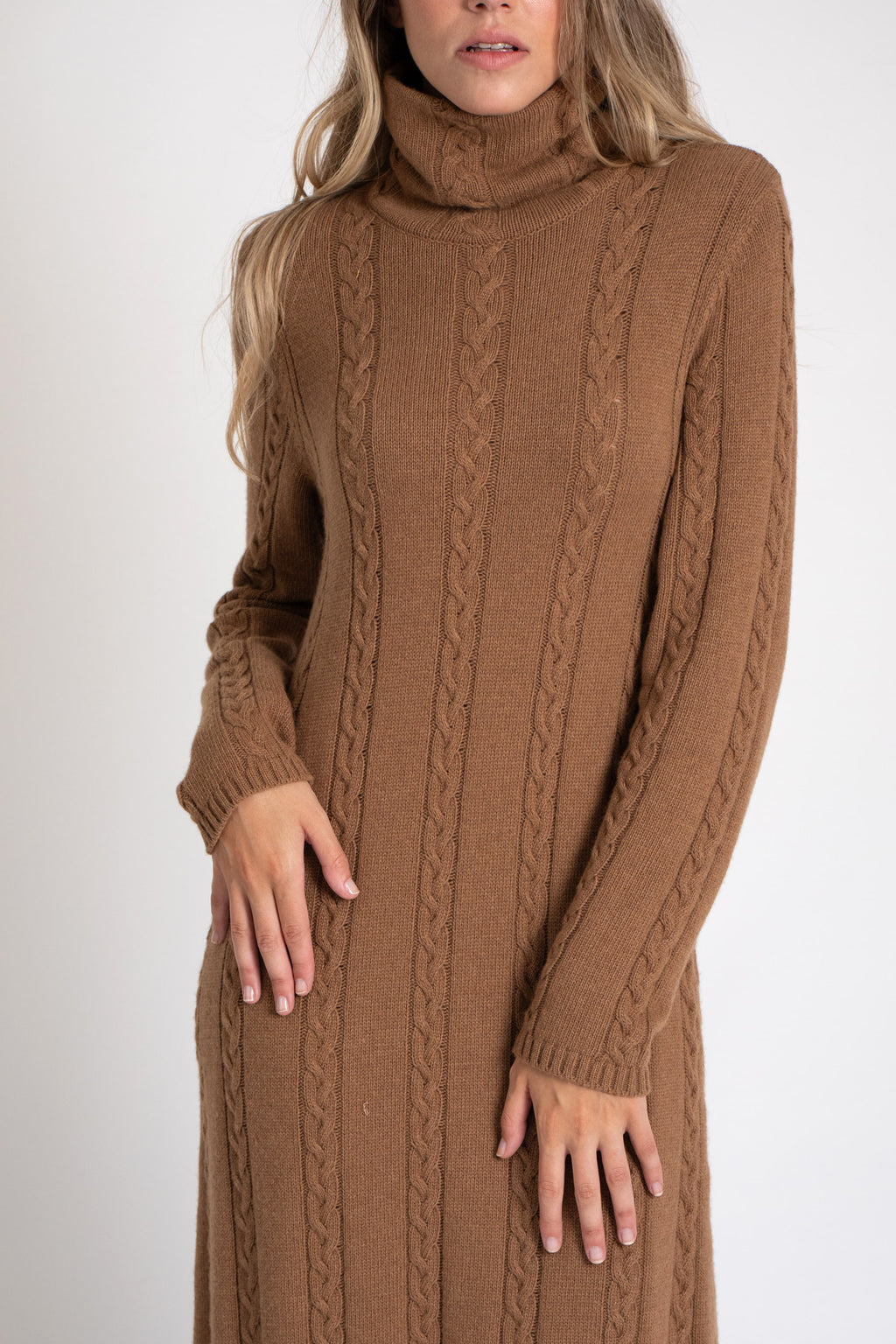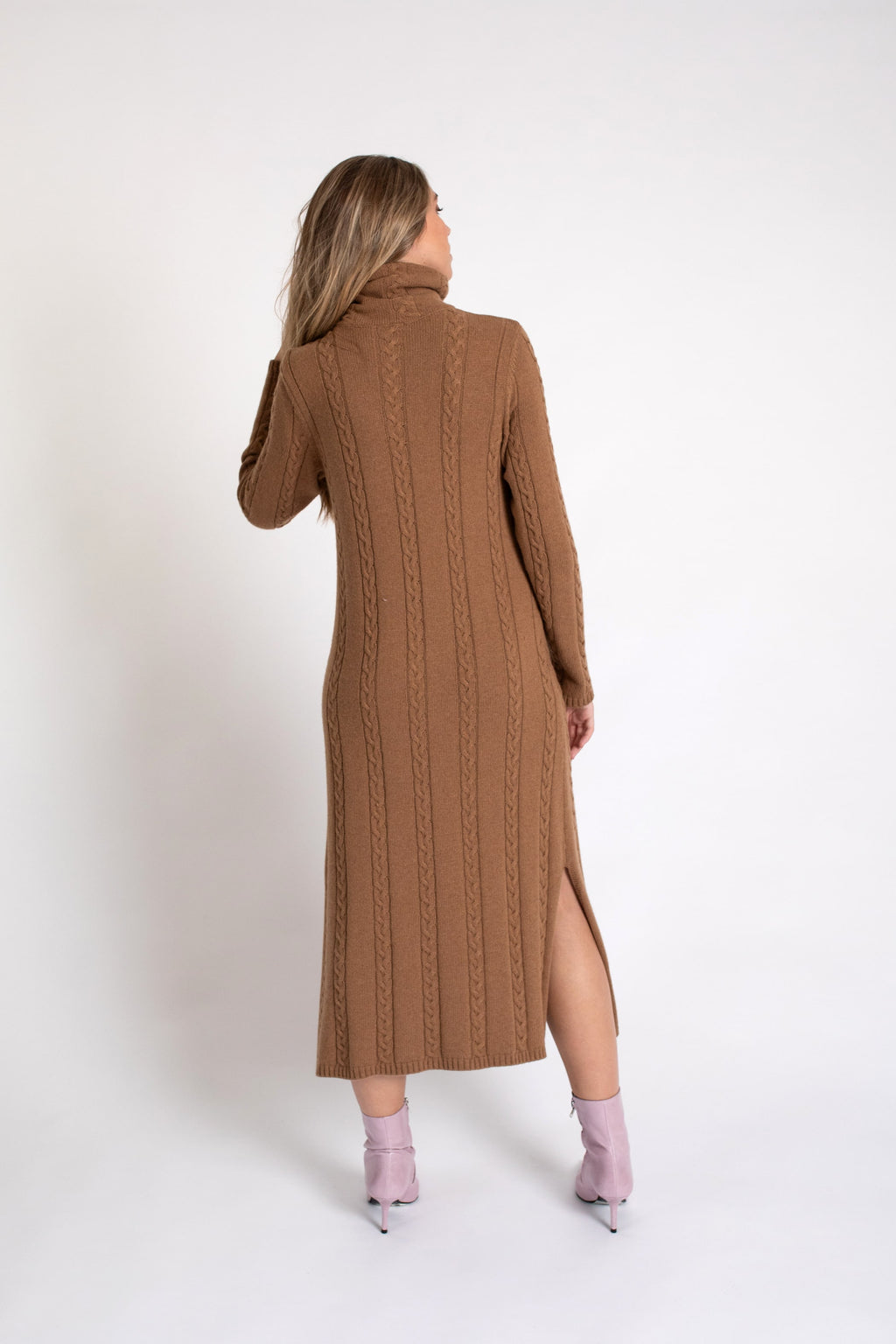 Vestido largo de punto tricot con ochos con amplio cuello vuelto. Modelo de corte recto, con manga larga y aberturas laterales.