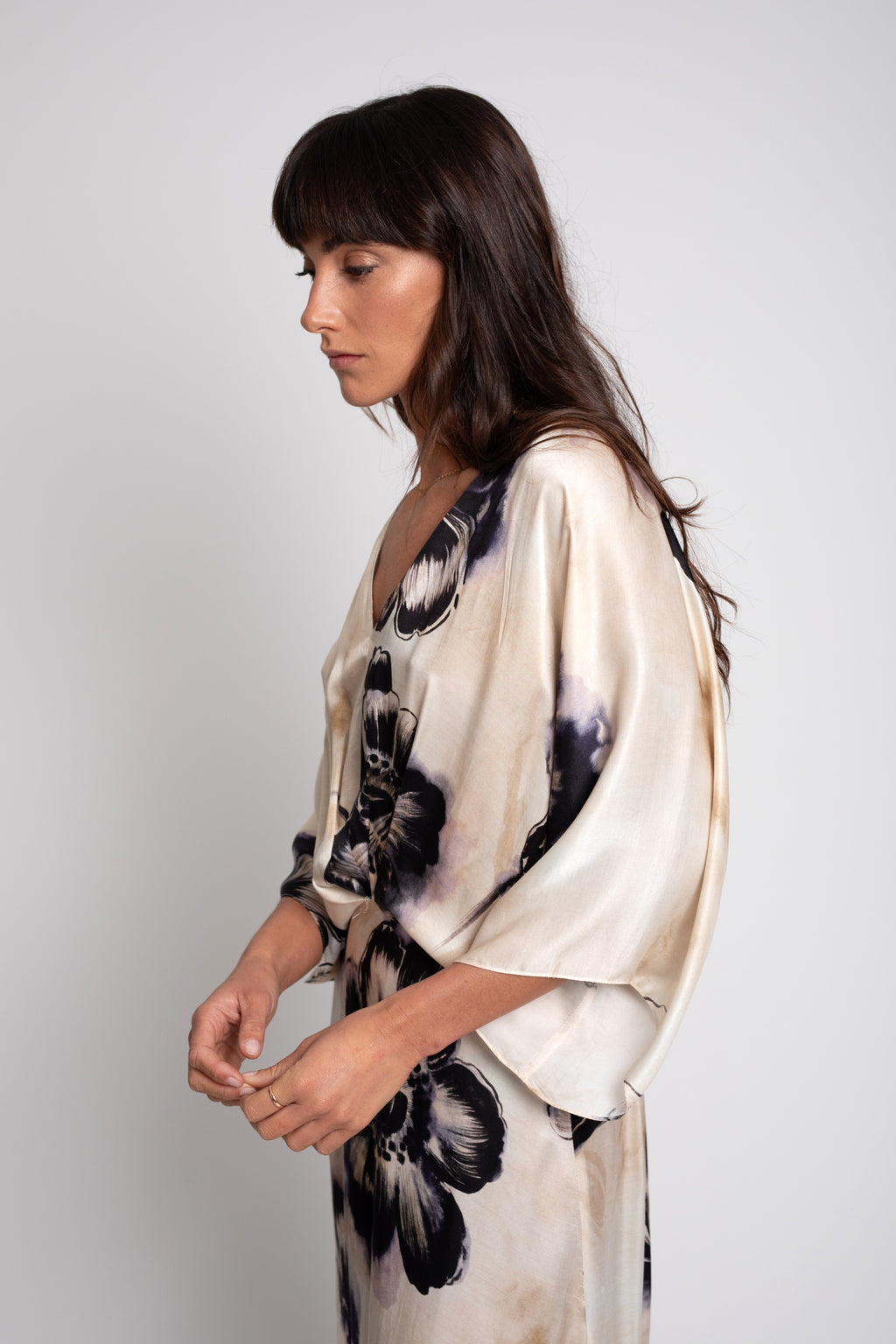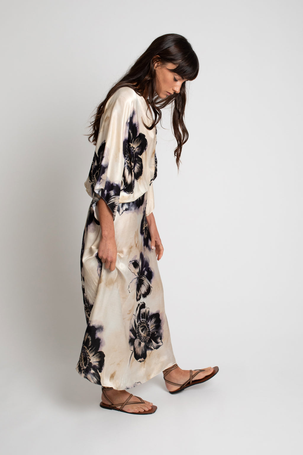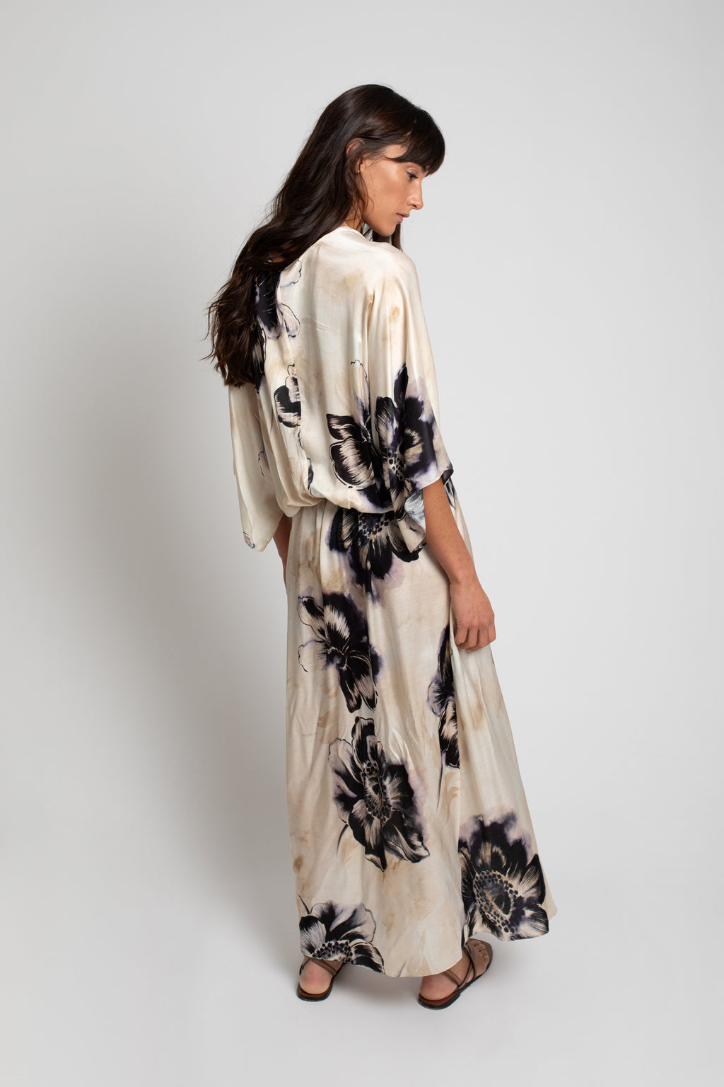 Vestido largo diseñado por Pisonero, confeccionado en una exquisita mezcla de viscosa y seda, con manga japonesa y estampado floral de aire sofisticado. El frunce en la cintura realza y estiliza la silueta, aportando movimiento y feminidad. Una pieza elegante y atemporal, ideal para celebraciones de día o eventos especiales.