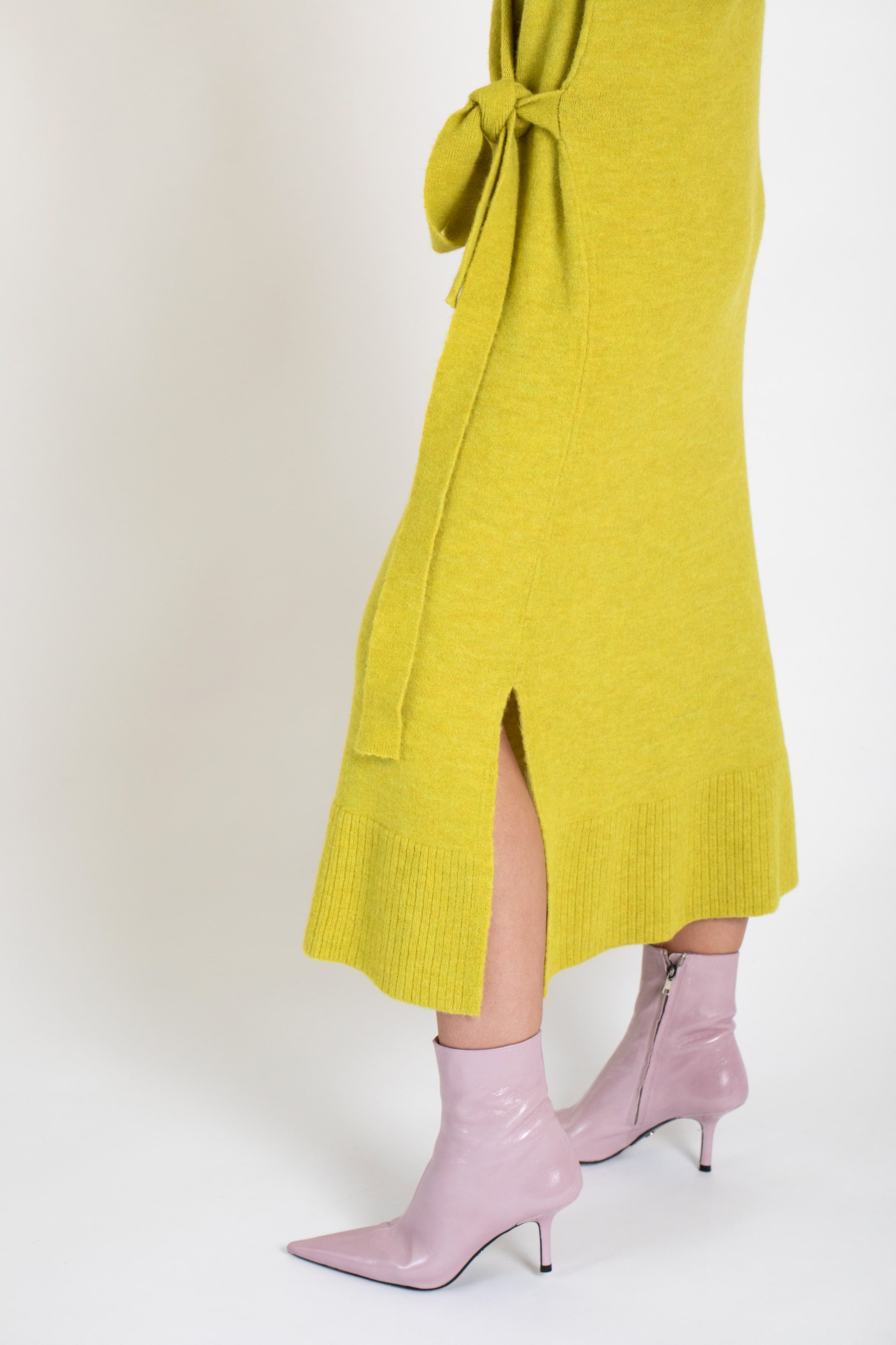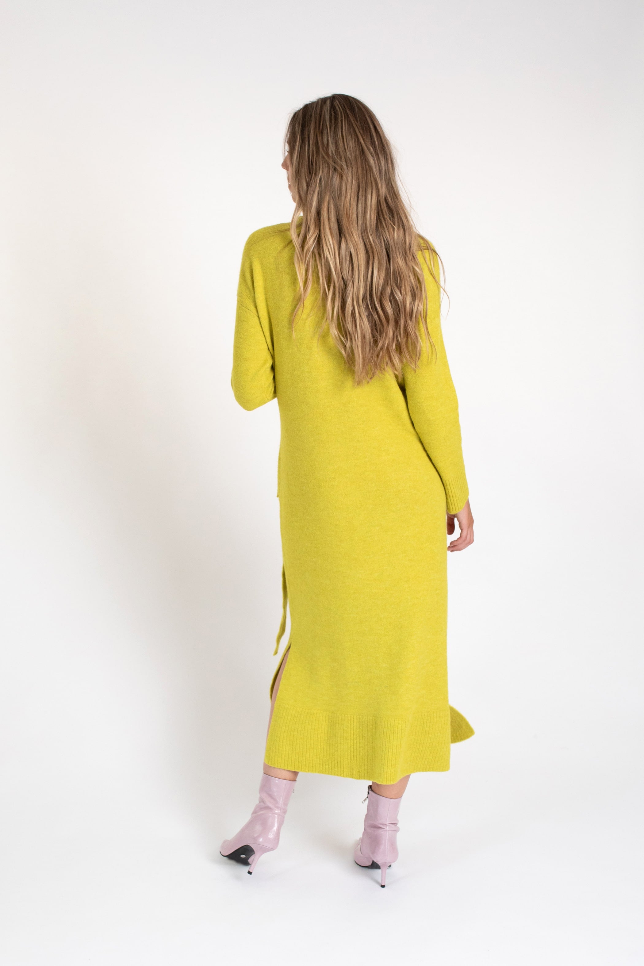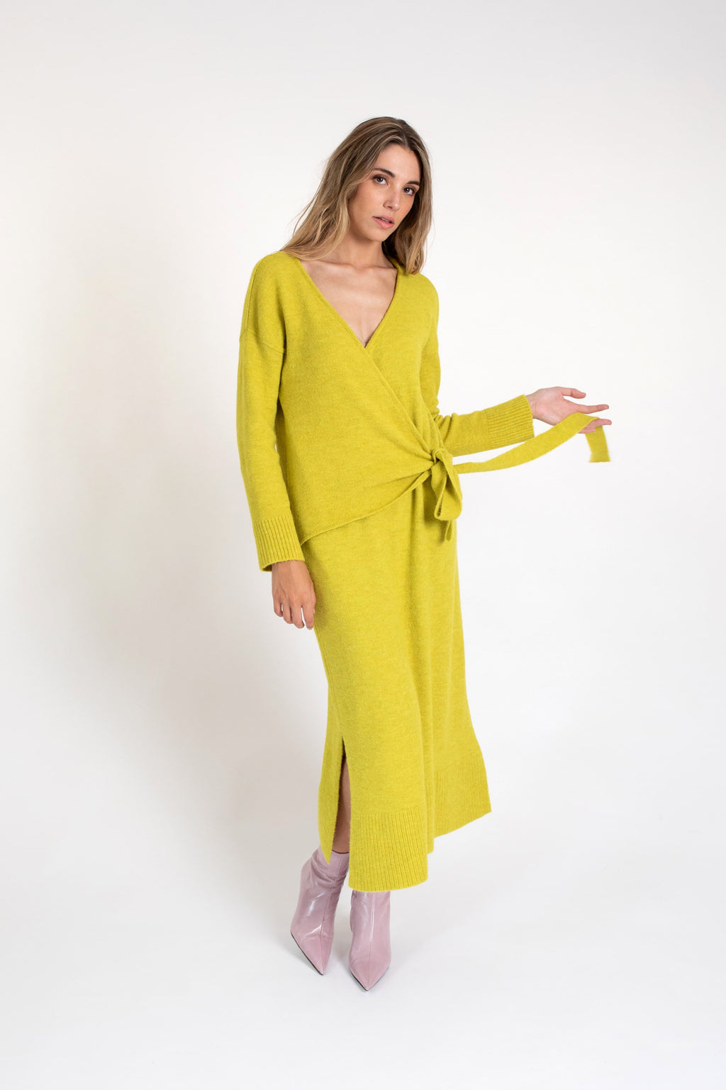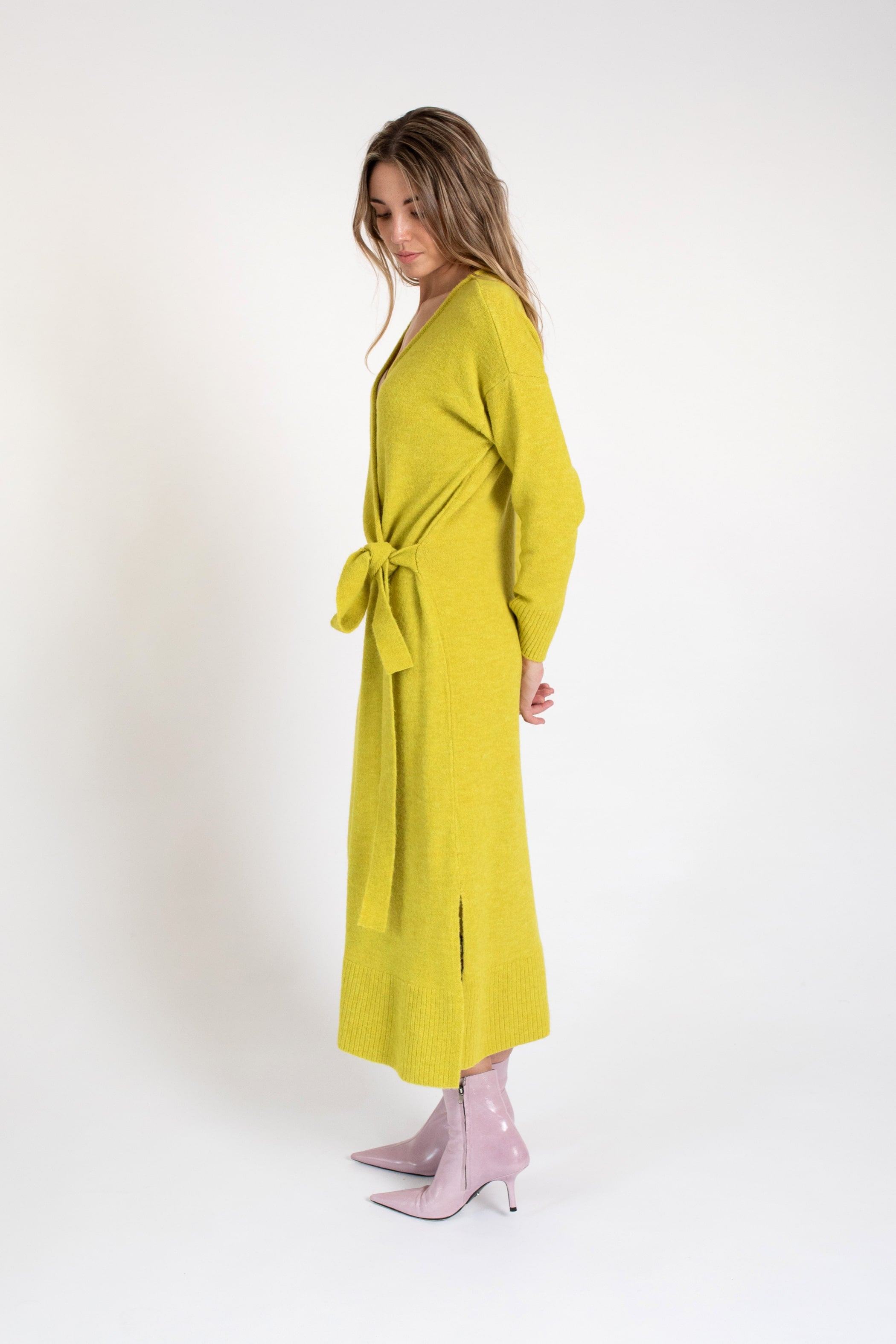 Vestido largo de punto tricot. Modelo cruzado tipo pareo con escote pico y manga larga. Cierre lateral con lazo