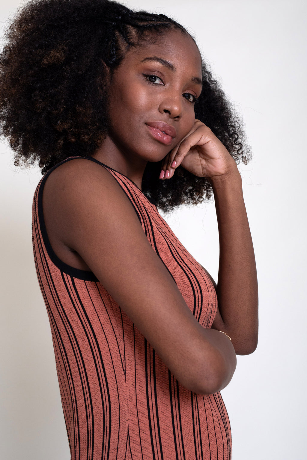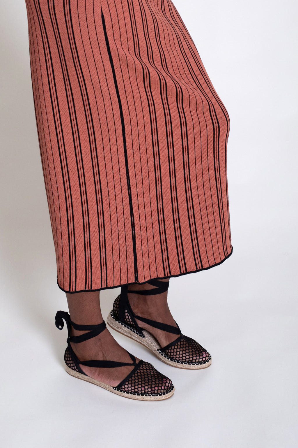 Vestido midi en punto tricot a rayas en color terracota y negro. Modelo de corte recto ajustado en cadera, con cuello redondo y sin mangas